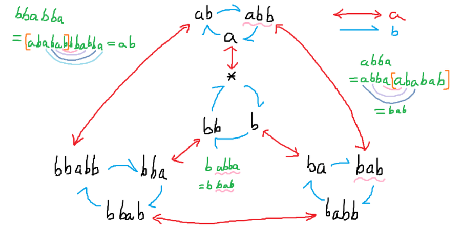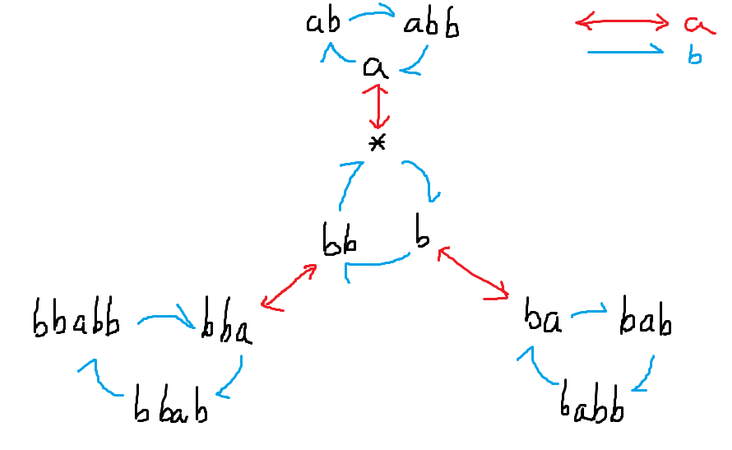 이제 여기서 중복되는 상태를 제거하고 겉의 6개 상태에 a 간선을 어떻게 연결해야 하는 지, 새로운 사이클이 필요한지 확인해야 합니다. 그리고 놀랍게도, 각 상태 뒤에 a 를 붙인 뒤 ababab 를 적당히 추가하고 aa 나 bbb 를 연속해서 제거하는 방식으로 동치인 상태를 찾으면, 위의 12가지 상태가 끝임을 알 수 있습니다!