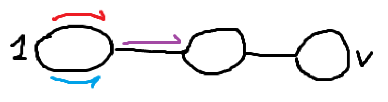 주어진 그래프를 사이클에 대한 트리로 해석합니다. 1번 정점에서 $V$번 정점까지 이동하는 단순 경로 중 지나는 사이클의 집합은 유일하게 결정되므로, DFS를 한 번 돌려 경로를 아무거나 하나 찾고 필요한 정점만 남기면 사이클을 0개 이상의 간선으로 이어붙인 사슬 모양을 얻을 수 있습니다.